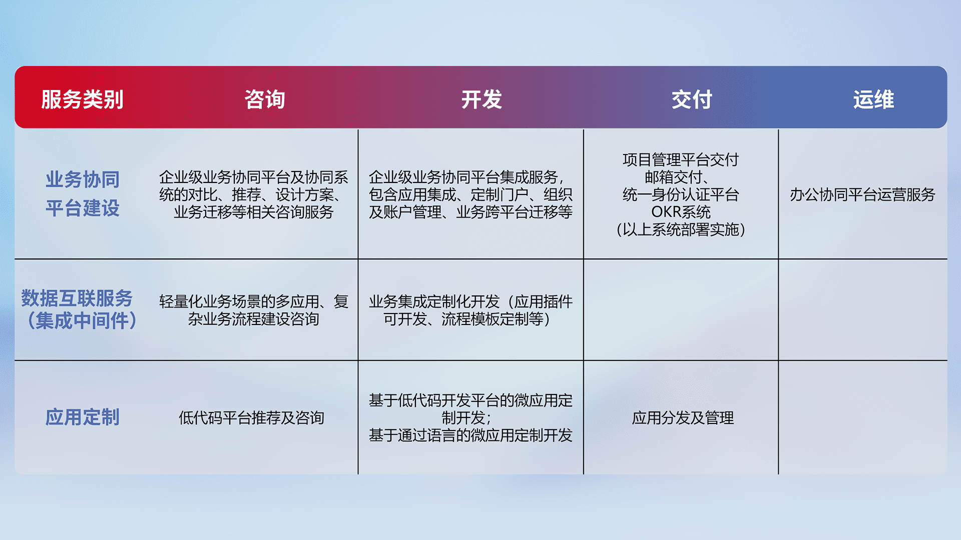 针对钉钉、、、、企微、、、、IDaas等平台级产品提供产品的规划、、、、方案、、、交付、、、定制化开发等服务,,实现如统一协同办公、、、、智能客户服务、、、混合会议管理、、、智能数据查询、、、等业务场景,,实现数字化转型。。