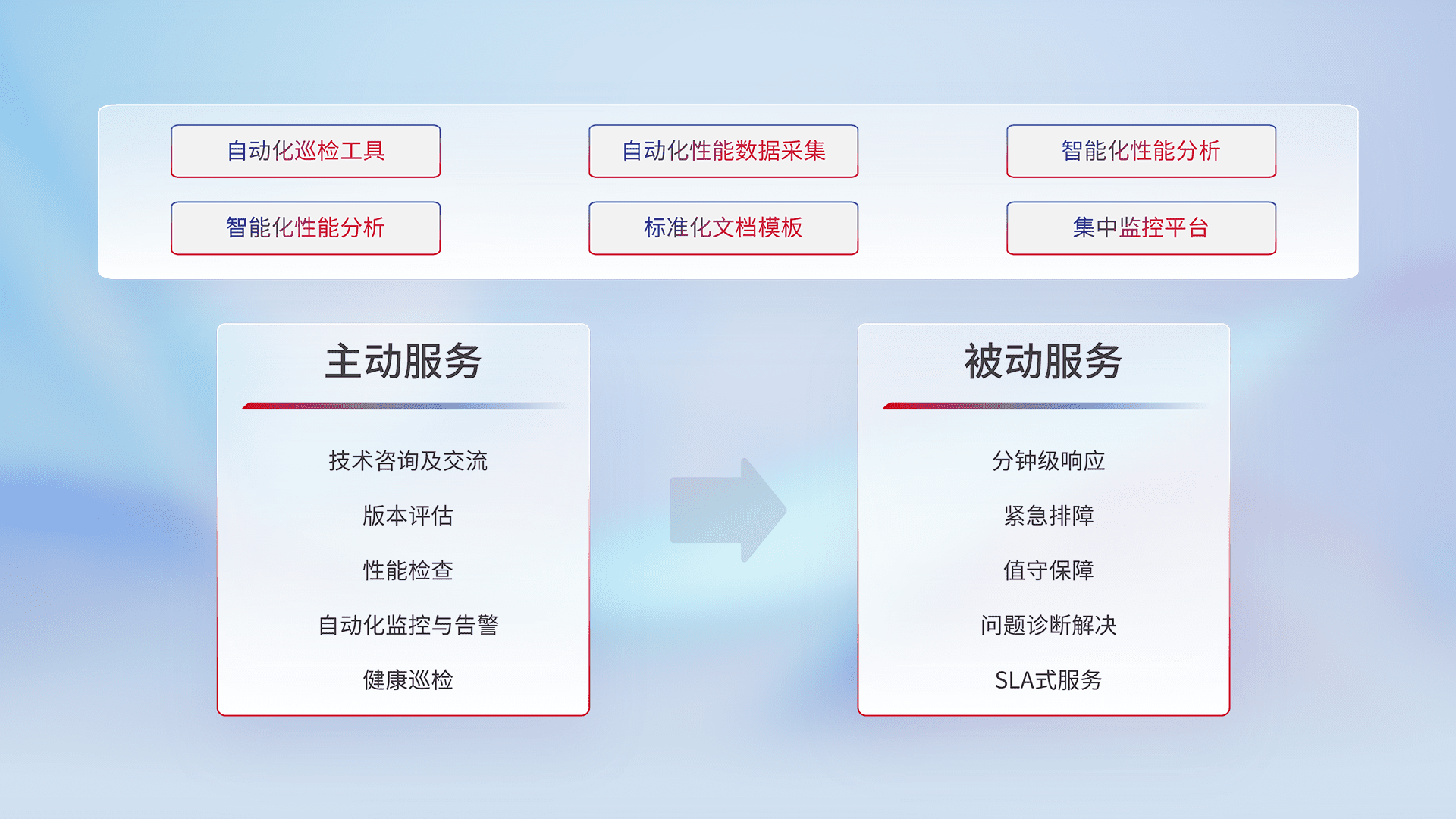 智能化工具和标准化文档,,,,保障服务质量,,,提供主动服务(包含技术咨询、、、版本评估、、、、性能检查、、、自动化监控与告警、、、、健康巡检)和被动服务包含(分钟级响应、、、紧急排障、、、值守保障、、问题诊断解决、、、SLA服务)。。